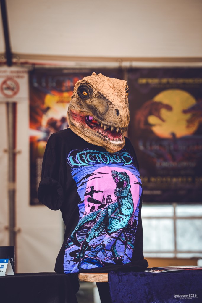 After Frank had repaired a small problem with the stage pedestals, we decided to check out what the merch stand looks like now. If you’ve ever seen a VICTORIUS show, you know that you simply can’t do anything with simple black and white designs. The more colorful and weird, the better! My personal highlight was a doll, which I will call Velo-Girl in the following. This female torso with VICTORIUS shirt and velociraptor head was simply the eye-catcher for me! Velo-Girl for permanent VICTORIUS mascot!
