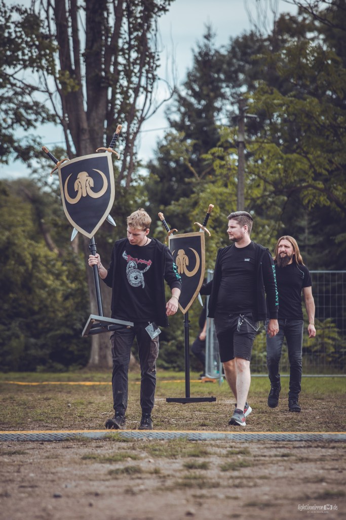 In the case of VICTORIUS means that about 1h before the gig the hot phase of preparation starts. On site there was no real private possibility for the bands to change, except for DESTRUCTION and ENSIFERUM. They had set up a beer tent and that was the „changing“ area for the bands… The guys had then put another beer tent bench, which was unused near the stage, into the tent as a place to sit, but more „comfort“ was not available here. In addition, they were also able to organize a mirror for their make-up from another band.