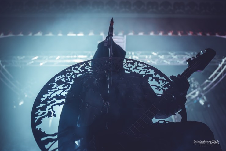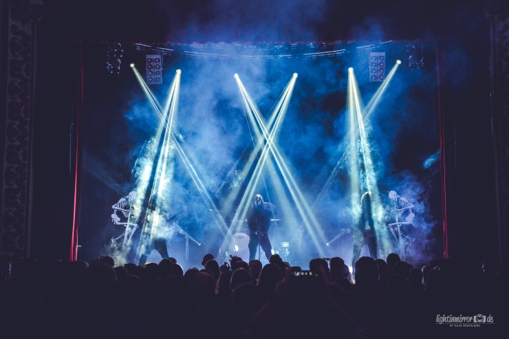 The hall had already been shrouded in a haze of fog by the other bands when the first notes rang out, hinting that the current release Todbringerin would play a leading role. The combination of the veil of fog and the melancholy, painful tones was certainly one that the ballroom in Dresden’s Parkhotel had never experienced before!