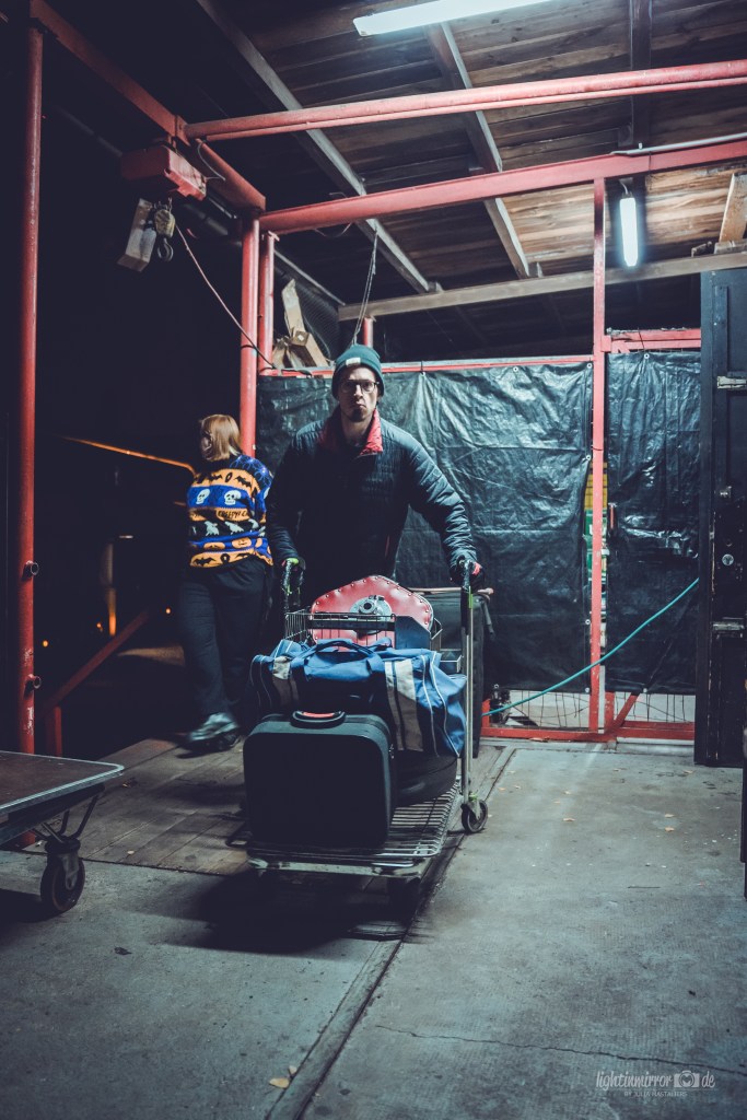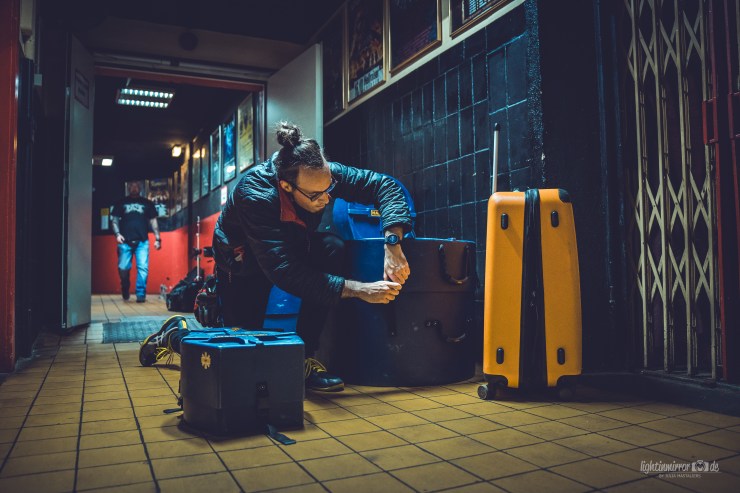 But no concert evening is over until ungodly amounts of pizza find their way into the backstage area. Just forget all the reviews on Google! Touring musicians can tell you best where to get good pizza! But multi-tasking was also required here, because what was in the club has to come out again at some point… Drummer Jakob in particular had a lot to do here: The drums are taken apart with firm, experienced hand movements and packed into appropriate boxes. Later, when the drums are loaded in, Mambo No. 5 and other classics resound out into the Leipzig night. Jakob, if you’re reading this, please send me your playlist! It was awesome!