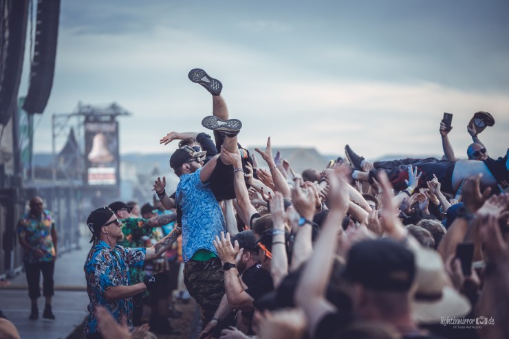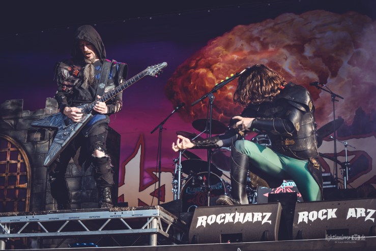 Next up was the third highlight of the day: GLORYHAMMER! It’s been a few years since I’ve seen them live! I used to be a very big power metal girlie and even though I’ve shed that 90% in the last few years, some bands still fascinate me a lot. GLORYHAMMER are such a band and already with the intro song Delilah by Tom Jones (supported by a cardboard stand-up of the singer) they had me! In their usual fast playing style, the band around singer Sozos … er… I mean Angus McFife, of course, quickly got the crowd dancing. The first song The Land of Unicorns was already the first reason for the catchy tune warning and the band kept up this strong energy the whole time. The stage set, which was modeled after a fortress, was also my favorite on the Rockharz stages that day. I thought it was a bit of a shame that they didn’t incorporate it better into the show, especially because the heroic fight against a goblin and his master Zargothrax, as well as the Hootsman’s artful consumption of an entire beer in one go, made for truly stylish interludes. You can just tell the band are extremely well-rehearsed and that only adds to the enjoyment. The new songs, He Has Returned and On A Quest for Aberdeen, also gave Rockharz an interesting insight into the upcoming adventures of Angus McFife and his bandmates. I would like to see a dinosaur (preferably a neon-colored T-Rex) somewhere in one of the upcoming releases, because a few crowdsurfers in inflatable dinosaur costumes have impressively shown how well that fits GLORYHAMMER! If I had to make one criticism of this gig, it would be that they didn’t play longer. (Is this the perfect opportunity to mention that you’ll be reading more about them here soon…?)