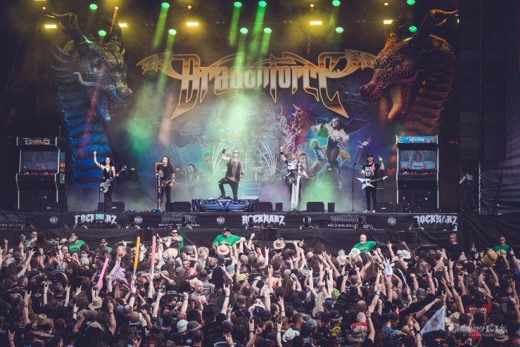The Fun-o-meter remained set to „Party“, because DRAGONFORCE took to the stage next. Just by seeing the oversized arcade machines and the huge dragon figure, the spectators were able to ascertain that something was about to decent on them! DRAGONFORCE once again demonstrated why they have the legendary standing they have by playing songs like Power of the Triforce, A Draco Tale, Cry Thunder and, of course, Through the Fire and Flames! The only point of criticism I have is for one person (or multiple people) in the audience: During Power of the Triforce, the band threw a stuffed chicken toy into the crowd with the expressed stipulation that it was to come back to the band after the song was concluded. That didn’t happen und someone kidnapped the chicken… I hope this person steps barefoot into legos! You simply don’t do shit like that!
